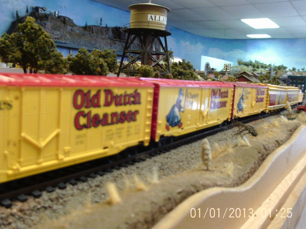 Sorry, should have packaged this in the first photo. This is the remainder of the Dutch Maid consist. Not visible is a yellow Rio Grande caboose. My non-model railroader sister in Florida inspired this train, and has sent me several pieces gleaned off ebay to build it up. Thank you May! With the groaning of the KM and squeak and squeal of Derilin wheels, who needs a sound system? This picture taken last week, live, in motion, at the El Paso Model Train Club.