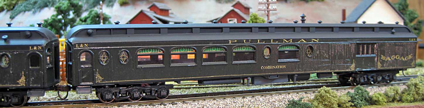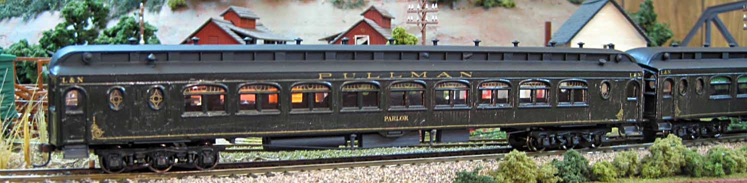 Here are the Palace Cars I got years ago at a train show, missing trucks and glass. Were also painted a horrible flat gray in someone's attempt to make MOW cars. with some of the windows plated over. The bodies still show scratches - hard to remove from wood-paneled surfaces - but with a fresh coat of Pullman Green, some new decals and a set of Athearn trucks, I think they look respectable again.