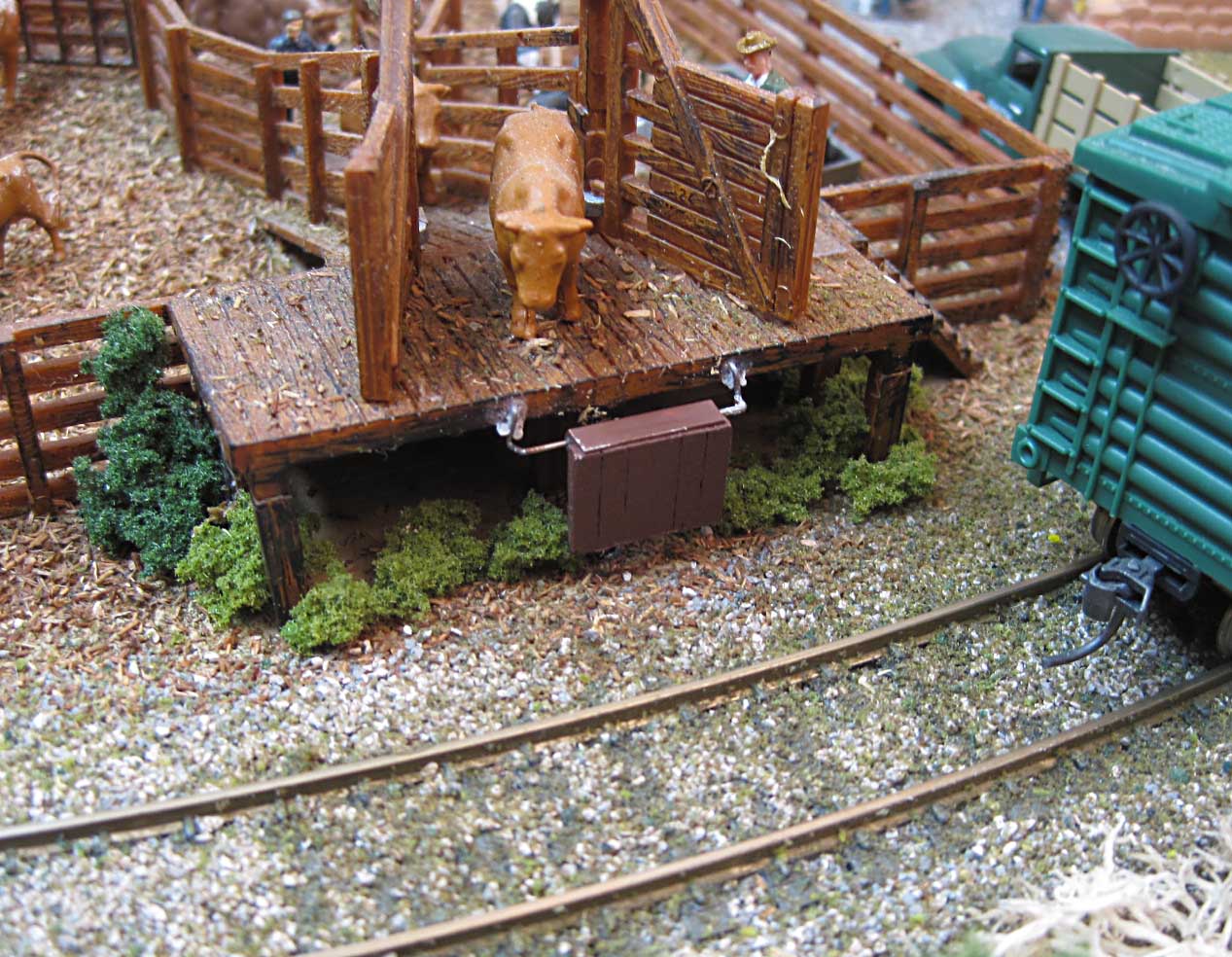And lastly, I cobbled together a ramp for my stockyard. The gap between the stock car and the edge of the platform, especially on a curve, was pretty glaring even at the 3' distance. Doesn't look bad when in loading position - I still need to paint the wire holders.