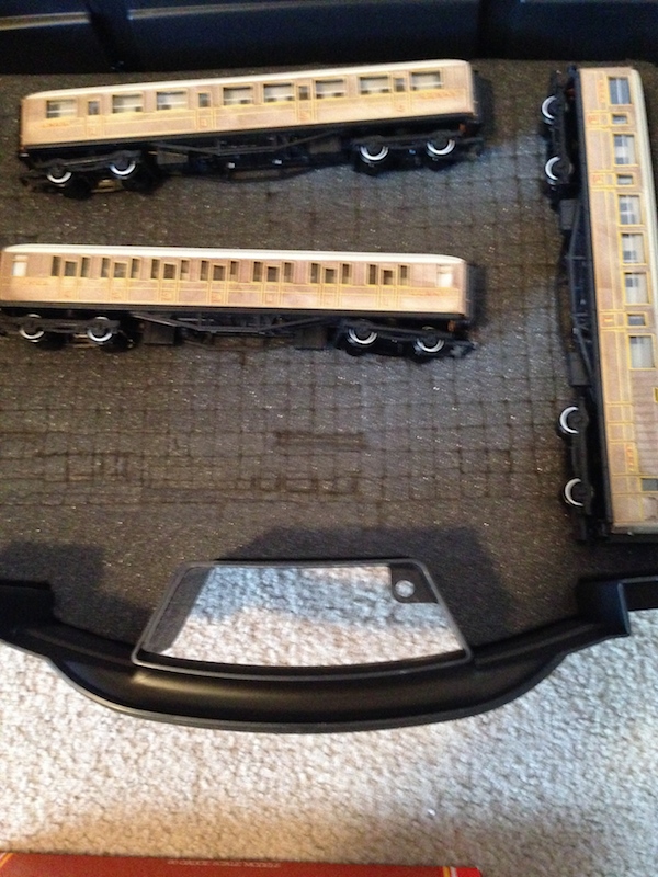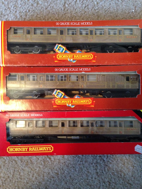 Those are the flanges? If that's the case then I don't think they hit the rails when I run the loco. I think only the older 00 gauge trains hit the rails on H0 gauge track. Most of the newer ones don't. I also forgot to post one of my 00 gauge rolling stock. Here it is.