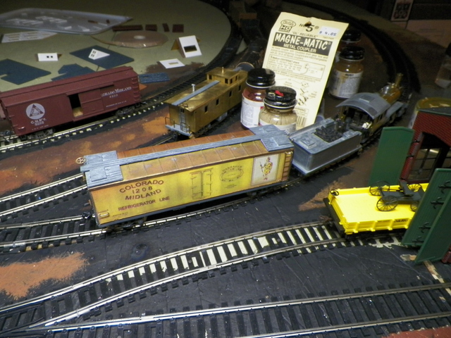 Choked up the cash for some new printer ink and printed a color card stock side for the Mantua Metal refrigerator car. Here it is entering "paint canyon" . . .