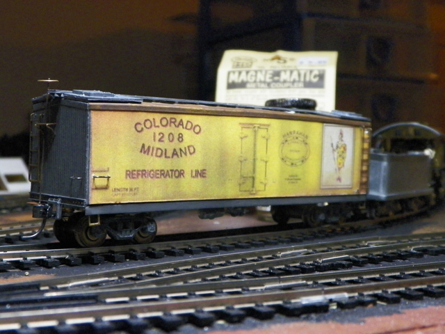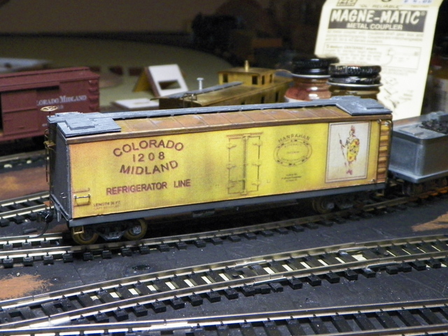 | Hey Don, I believe I found the image either on eBay or on Google [images], right clicked to save the photo, cropped it in the Windows Paint program (to remove wheels and everything but the side of the car) and saved it as a .jpg file. Then I brought the .jpg file up and printed it 4 X 6; as if it were a photo. Then I calculated the length I needed (5 9/16) divided by the length of the cropped image (6) and came up with that I needed to copy the image to 93% of the original (4 X 6) size. I ultimately had to trim a tiny wee bit with a razor knife that was hanging over the edge of the aluminum car sides. It was easier for me to do this with the Mantua refrigerator car since there weren't any opening doors to deal with (as on the box car). To attach the card stock side to the aluminum car side, I used one of those "roller glue tapes" where you unroll the glue on the back of a photo or whatever you have. It will hold good. Big problem is if you don't lay the paper down straight to begin with.