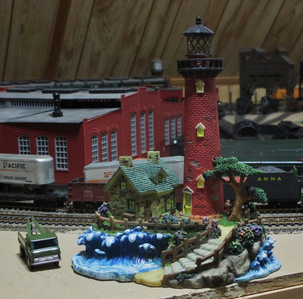 I was going to paint ground level the tan at the base of the stairway, The waves will become hedges painted forest green with brown for the wood parts. I'll do a before and a after. * The lighthouse doesn't light up, I guess a determined person could make it light up. frank