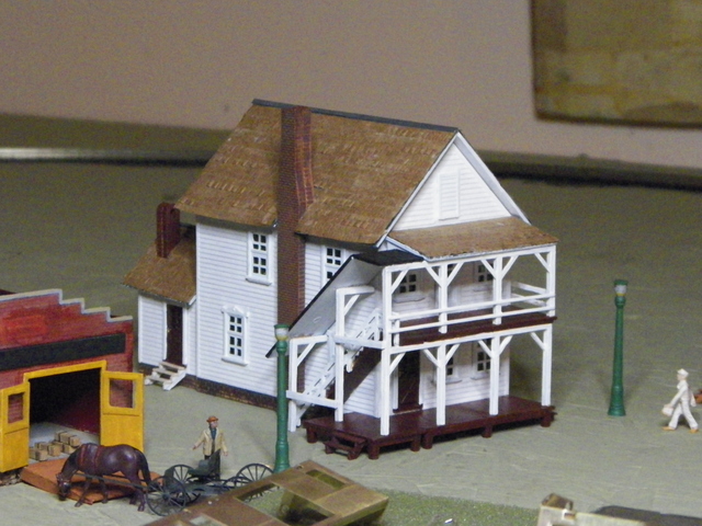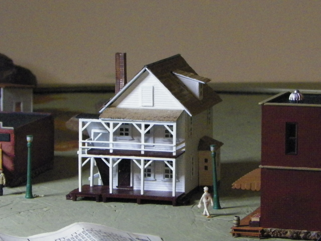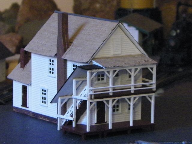 I did that same building recently Jerry. I left mine as a rooming house. I like what you did with the porch; the columns and the way you painted the supports. I thought I would try to cover the chimney on mine with small stones, but I guess I didn't get them small enough; didn't get it to look right. The roof on mine looks better now than in this photo (have since covered it with flat enamel which seemed to soak in and settle down some of those paper shingles that made repair spots obvious. I need a bunch of those guys from the rail yard to come rent some rooms now.