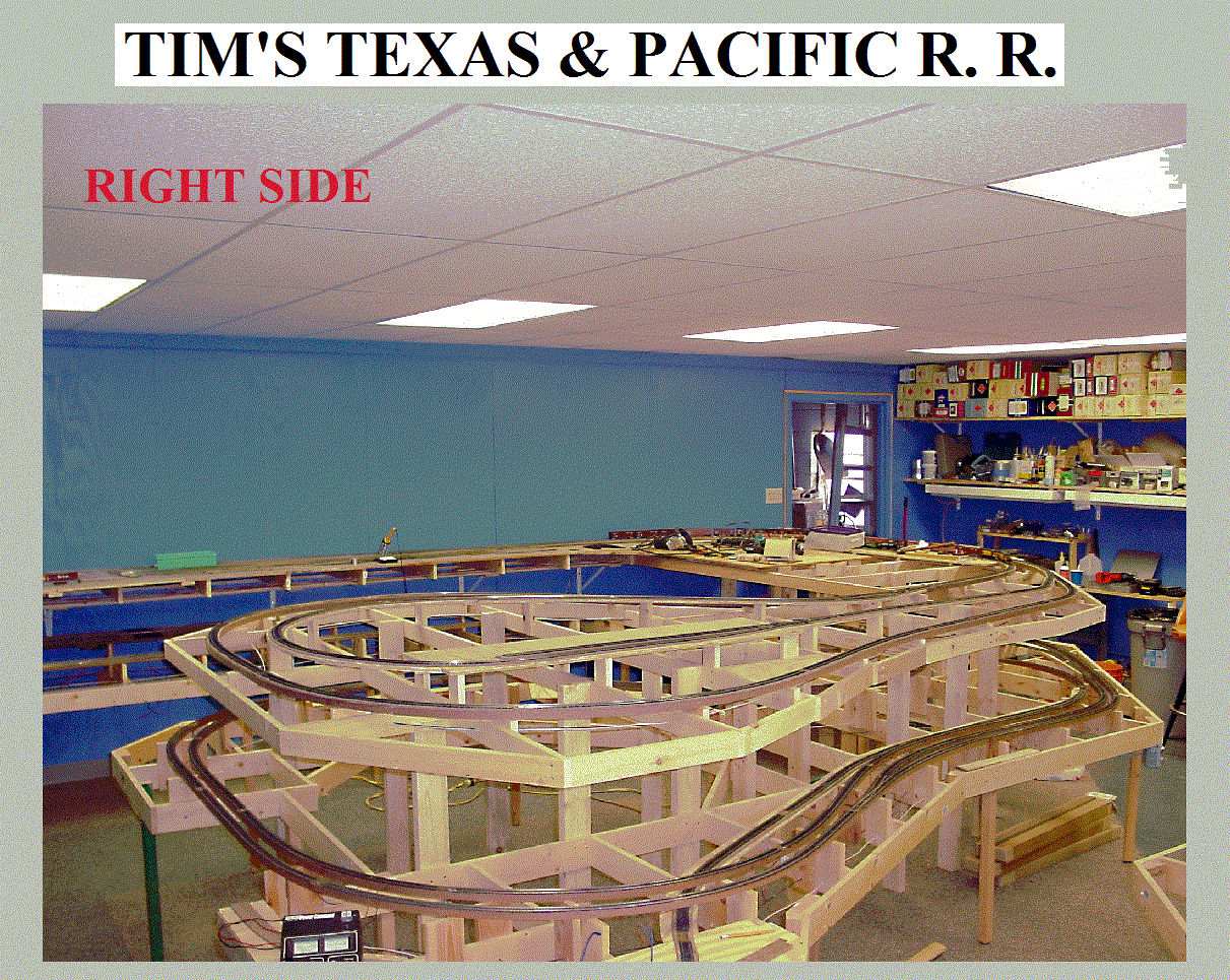 Most of the work was done in the first 5 years. The overall layout design was Richard Brown. Tim built or modified all the engines or rolling stock, Brass steam engines of T&P origins and all the rolling stock had Kadees and metal wheels. The operation of the track work and trains was very good. Tim was a machinist and a perfectionist. I took care of the wiring and DCC with a lot of help from Richard. Bud was our resident old guy who had once worked for the Union Pacific in Bakersfield Ca. My son-in-law Jay Johnson was the young guy and got to do the heavy lifting and crawl around under the layout. In the last five years we were down to Tim, Bud, and me. Health and the oil boom limited our energy and time, so not much happened the last 5 years. Lot of fun, fellowship and good times were associated with this layout.
