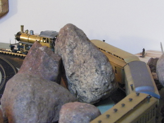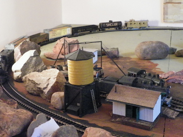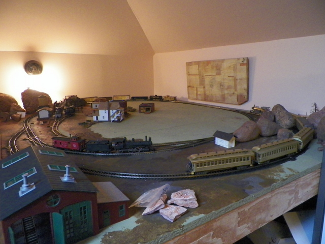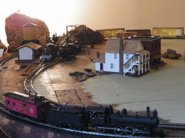 Then I decided to take a few shots around . . . this first one is of the 54" X 60" spread. 22" radius on the mainline and 18" on the passing track and yards; with one piece of 15" radius in the east engine house yard. No road bed this time around. Don't know what I want to do about that yet. Many early west roads didn't really use much of a road bed.