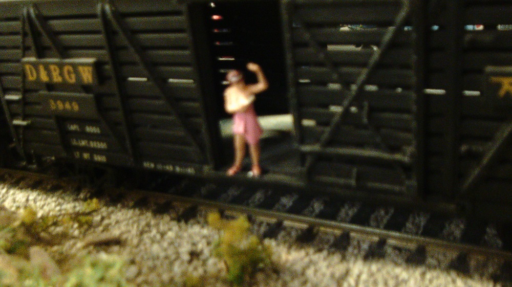 Ok, so this is weird. My sister May sent this from Florida, figure by Preiser. So, how this is going to work is that she will have an elephant behind her, soon, and the car will be in tow behind a Life Like circus train, thus she is a performer freshening up in what she thinks is the privacy of the elephant car.