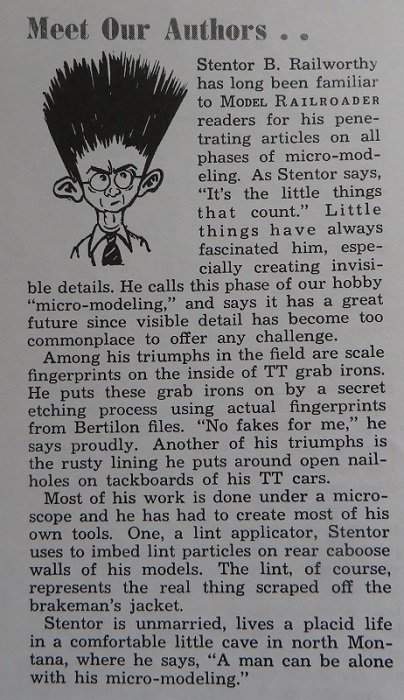 Swink, Colorado - Apr. 19, 2014 The Otero County Regional Model Railroad Association (RMRA) has announced the winner of the 2014 Stentor B. Railworthy award for micromodeling and invisible detail. This Coveted award is named for a frequent contributor to Model Railroader Magazine who was featured in this article in the April, 1952 issue: