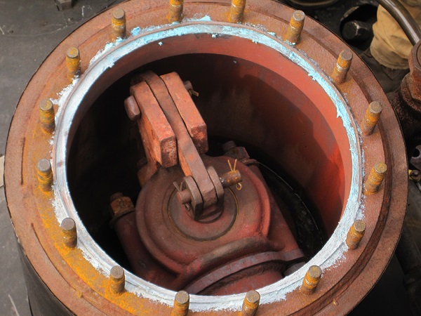 Alvin added a scale model of the throttle, authentically tinted with HO scale oxide red boiler paint. Studs were added where the steam dome cover attaches and were authentically tinted with rust. The steam dome interior is shown here: