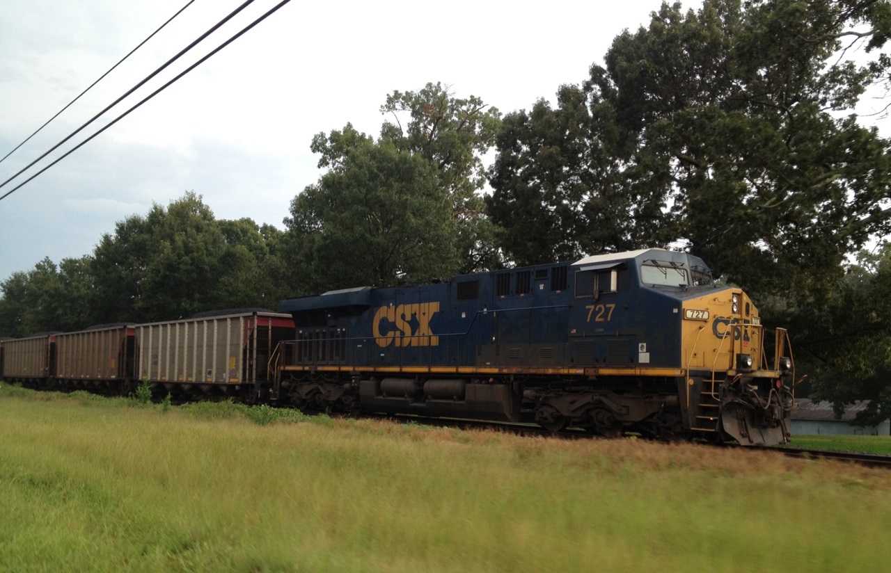 CSX 727 performing pusher service along US 74 between Ellenboro and Mooresboro, NC on August 31, 2013: