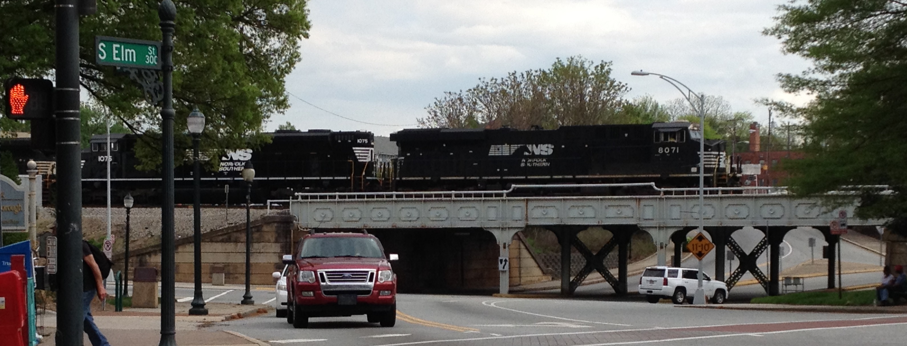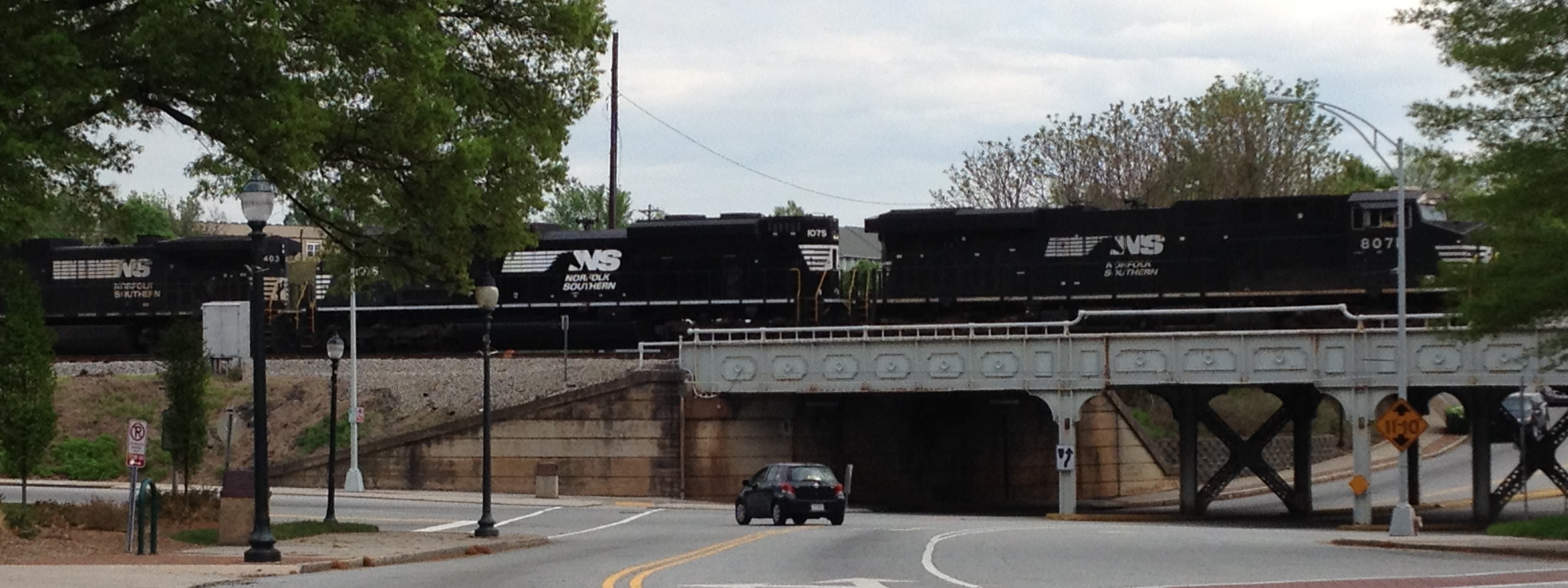 Norfolk Southern freight idles on overpass in Greensboro, NC April 18, 2015.