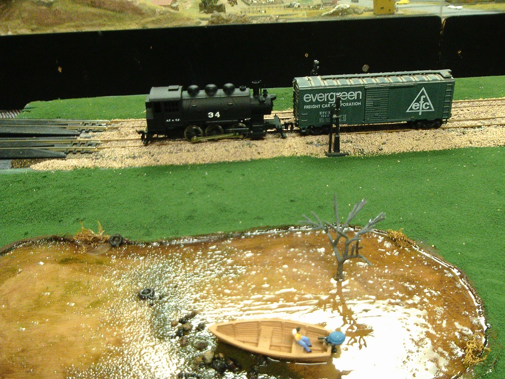 That was Jose's Harbor, this is my "harbor," more of a swamp, on the Dallas Station module. I love bridges, so to make an excuse for shoe horning in a small bridge, not visible here, to span the swamp. I couldn't make it a proper river, spanning the module, because the midline between the two main line tracks did not permit doubling of bridges. The little boat has been sitting in my scrap box since I bought in in 2007 at the LA Train Show. Thank heavens I finally got to use it.