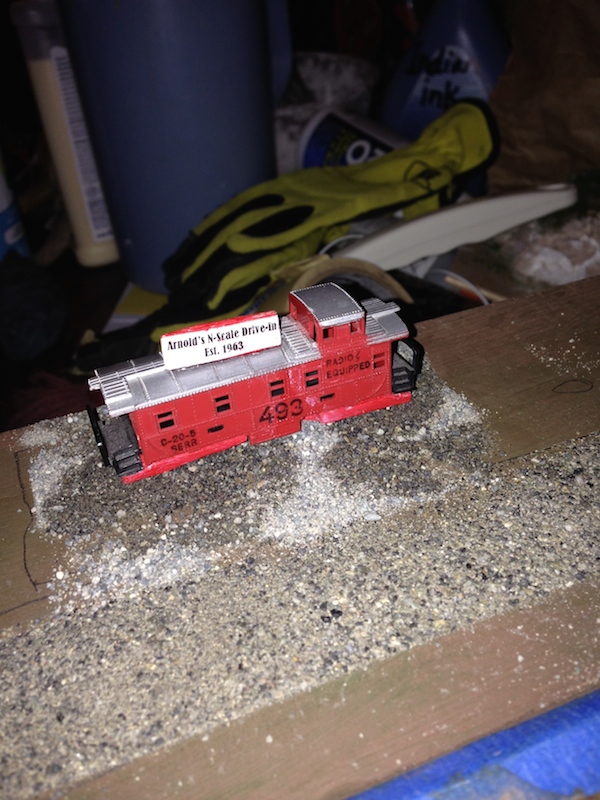 Anyway, just now I cut the sign so that it would fit on the top of the caboose similar to how a lot of drive ins/diners do it. Here's how the billboard looks now. (I'll touch it up.)
