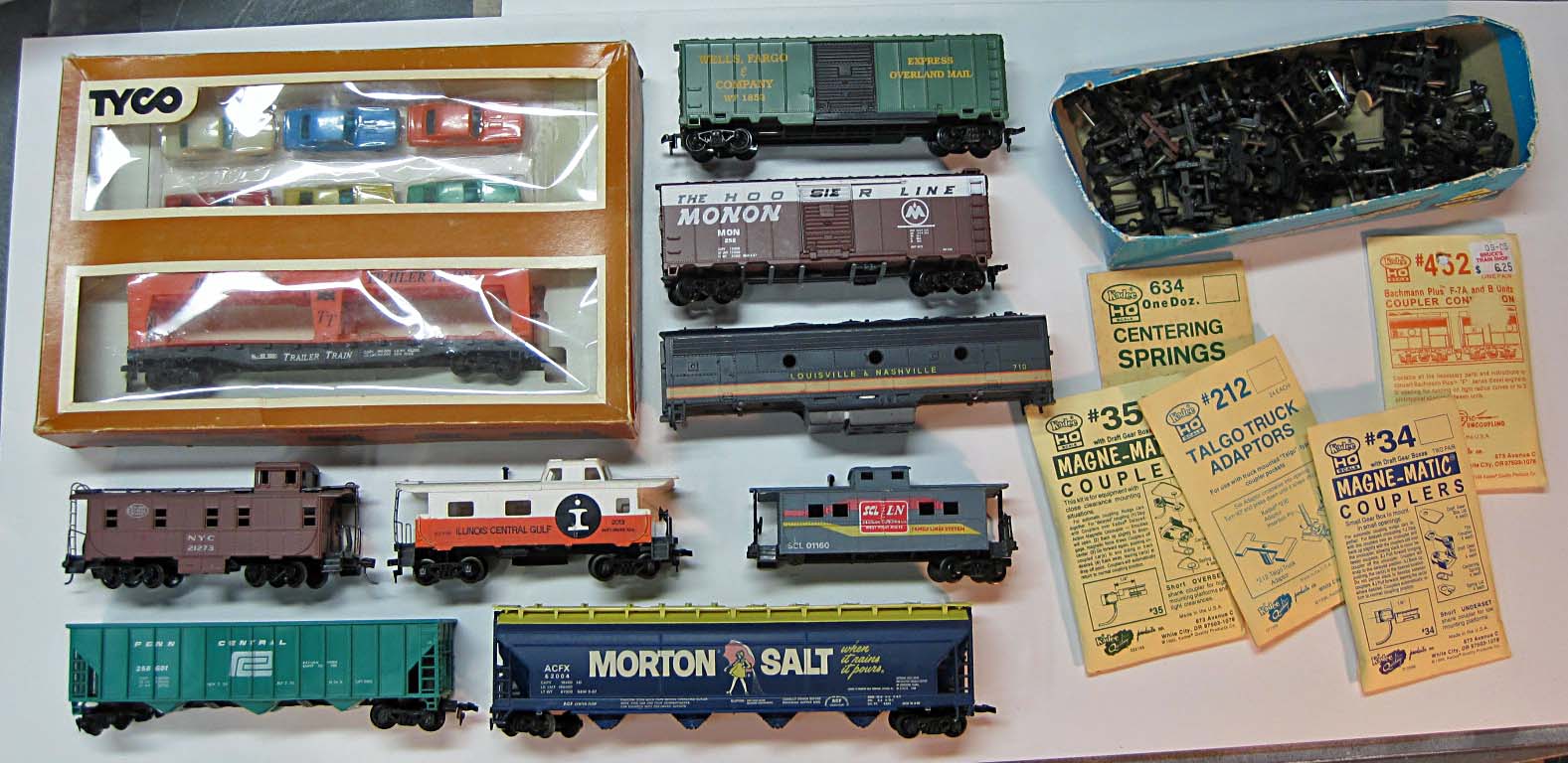 Here's my pile of goodies from the show. Got a nice box of mostly Athearn (I think) trucks, a few metal sprung one in there too as well as a sprung arch bar truck (anyone can use one let me now and it's yours). Some handy Kadee couplers and related for cheap. A decent Morton Salt hopper, a new condition Wells Fargo, a nice Athearn Monon boxcar missing a coupler for $2...and a complete Tyco autoloader with Camaros and Javelins. AND last but not least, a decent Howard Johnson's and a workable 7-11. Will post some pics of the show tomorrow, was a lot of fun.