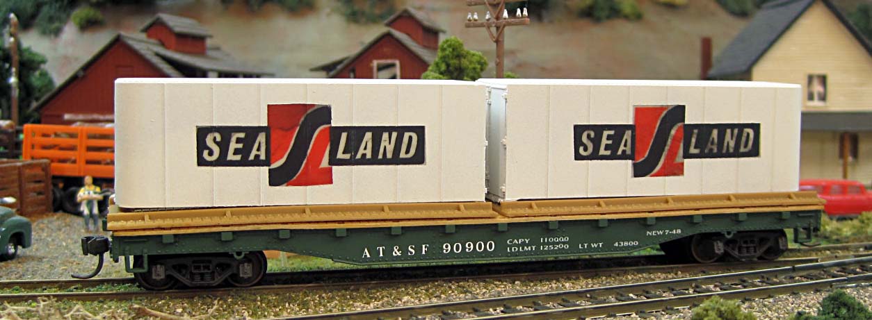 My first restoration of sorts from the yard sale junk box - a Tyco ATSF Sea-Land container flat. This thing was in sorry shape, the victim of someone with a big brush with brown enamel paint attempting to "weather" it.  Luckily, the Sea-Land logos were mostly spared - so I masked them off and painted the containers with white. The flat car body was repainted and decaled with Microscale decals for the letters and numbers, and scrap data decals from a hopper project. Added some Kadees and of course - when available - will give it some metal wheelsets. I really enjoy bringing these old survivors back to life.