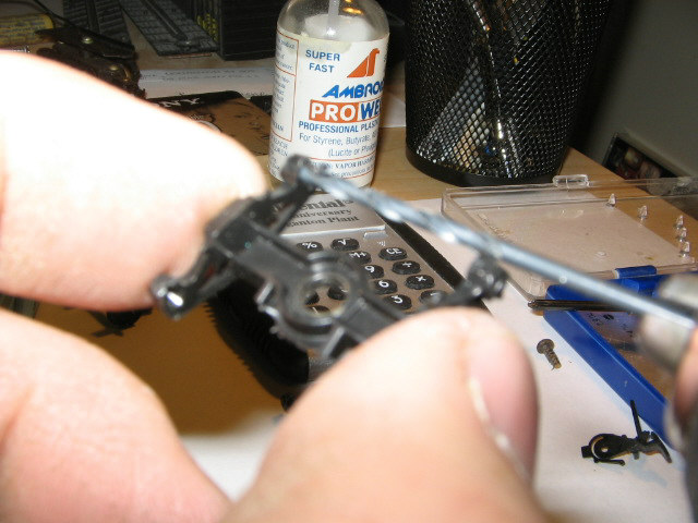 using 5/64 drill bit and holding truck-carefully enlarge holes on truck to install metal wheels. you must do this for them to roll freely. if you are going to use stock wheels skip this.(drilling tip-let drill bit go into hole slightly-make sure all plastic is out of hole