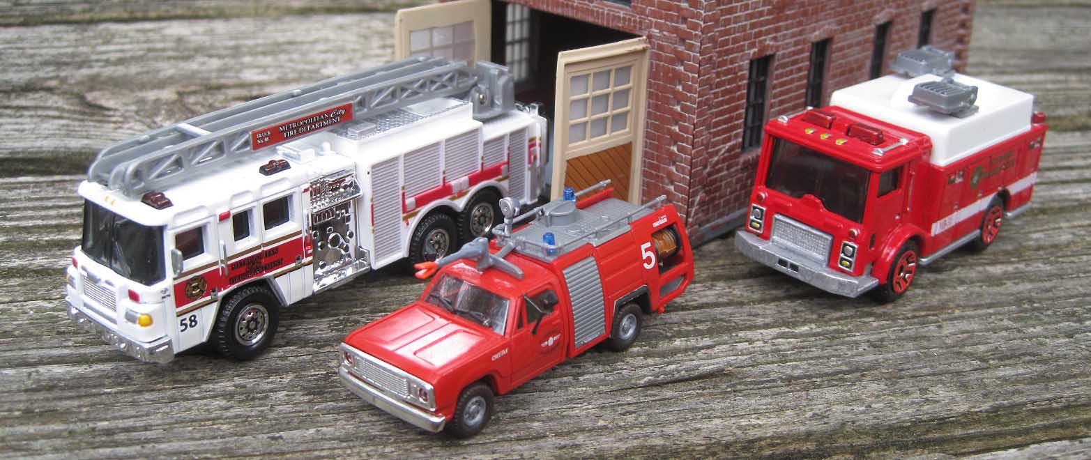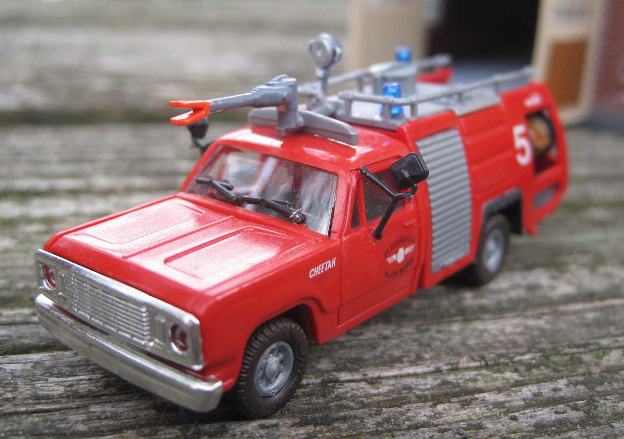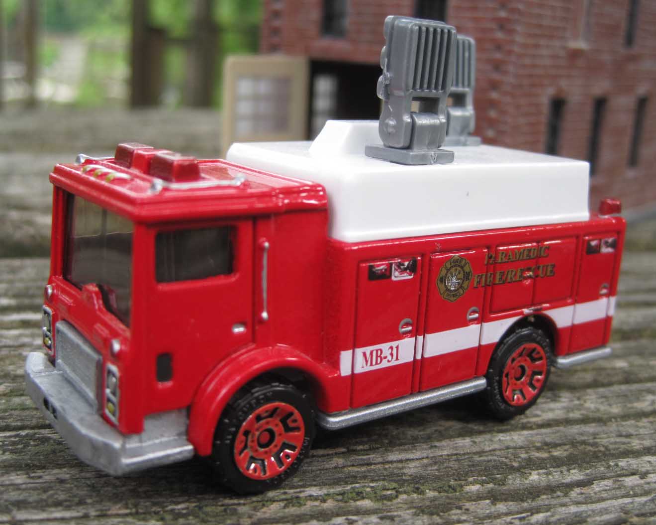 Going with a fire fighting theme today. Some inexpensive vehicles - the ladder truck and the smaller fire truck with aux. lights on top are Matchbox that I painted some extra detail on. The red #5 Dodge is a Roco I got with a lot of stuff at a flea market.