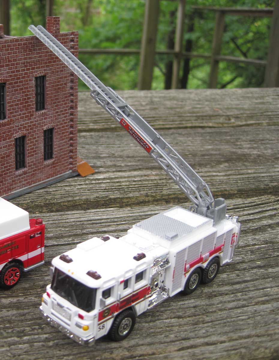 quote:Going with a fire fighting theme today. Some inexpensive vehicles - the ladder truck and the smaller fire truck with aux. lights on top are Matchbox that I painted some extra detail on. The red #5 Dodge is a Roco I got with a lot of stuff at a flea market. Originally posted by JNXT 7707Â -Â July 06 2014Â :Â 6:30:14 PM