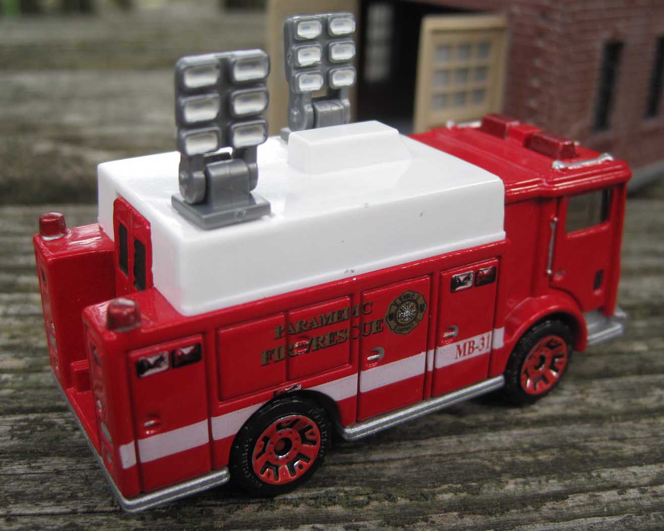 About that Matchbox fire truck The floodlights do extend up Pull on the flood lights to make them higher I found out about that by accident