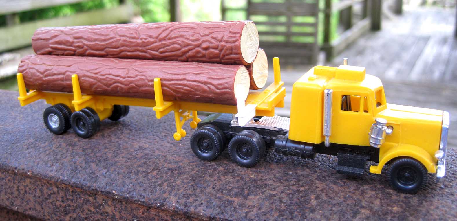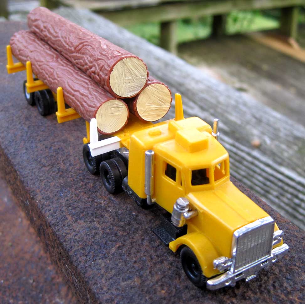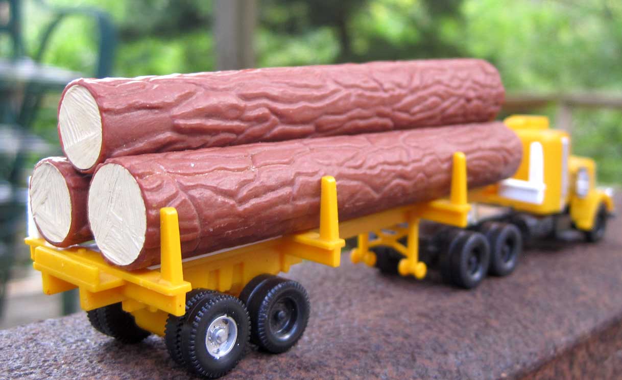 My AOTW is a Cox Big Pine Lumber log truck. Rebuilt it from a yard sale find but have not had a chance to paint the plastic repair. The trailer was missing a pair of wheels so I found a use for an Athearn wheel/axle set.