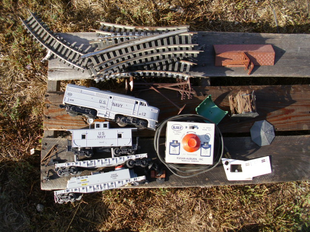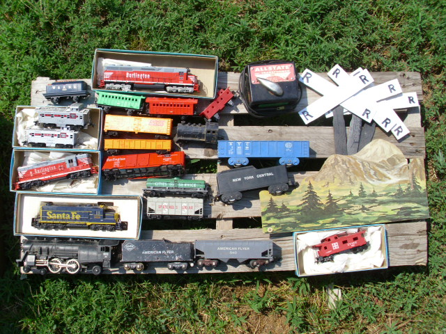 Hey Buss ! A very good find. The 2 Burlington diesels with cabooses make for good reliable power when you find other ones with drives. The red and gray paint is good looking to. Those old 1850- 1860 coaches can get re-trucked. with vestibule railings, and give a good representation of that times cars. There are a lot of S gauge collectors out there so the American Flyer loco and car can be used by someone. * That was some good train hunting you have done. frank