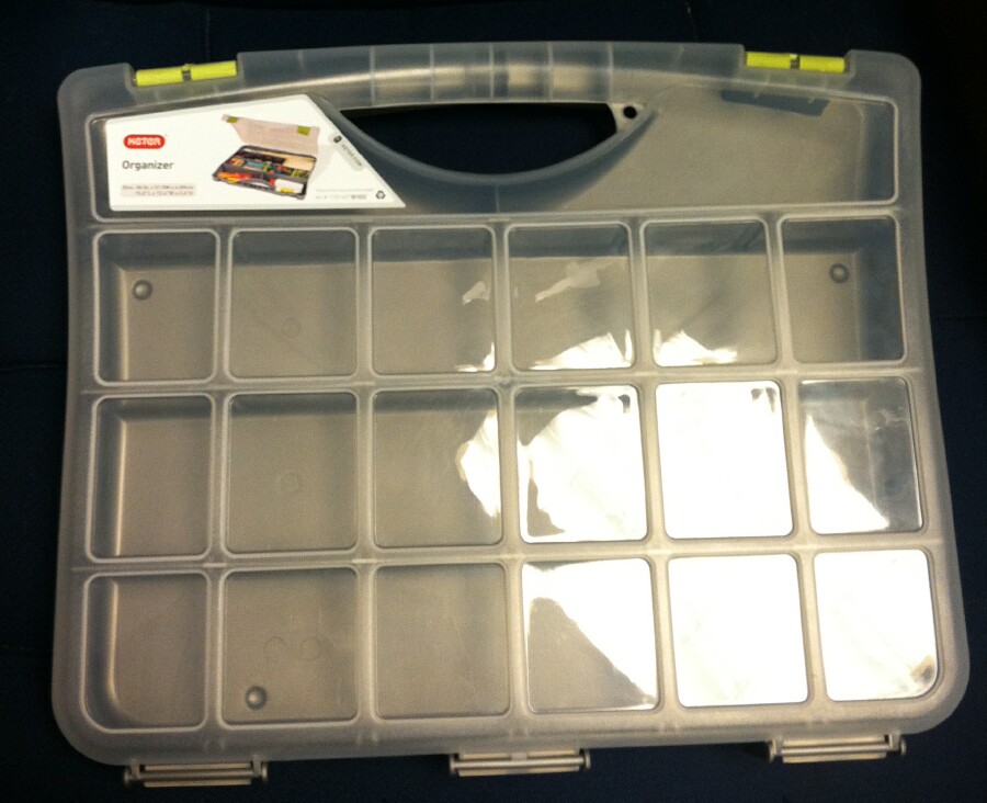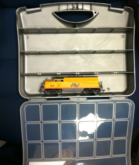 Anyway, I was wandering the sports/fishing area this week at one store, and noticed something new. It is an organizer case by Keter, Wal-mart had them in the far corner of the store where misc. sporting and hardware items go. I took it down, looked it over, hmm. Might work! Has a carry handle, 3 rows to hold trains, and two other smaller compartments. $5.97. Not bad. So, I bought one, and took it to work to try it out on my train engines I have there Here's what it looks like -