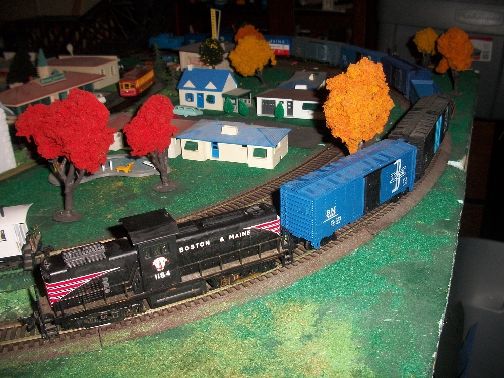 A string of mostly Tyco B&M box cars towed by ersatz RS12, gifts from Leo G. of Massachusetts, who prowls train shows and estate sales with his lady friend, when he is not growing tomatoes and taking the grand kids to the Butterfly Atrium.
