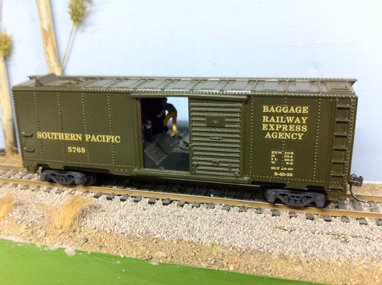 Tyco operating boxcar custom painted as a Southern Pacific express boxcar. It's frequently added at the head of my SP passenger consists.