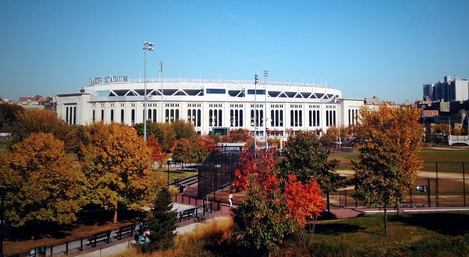 At Metro North stairway in the Bronx looking at Yankee Stadium.