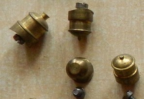 Top right - the three round things are turned brass bases for steam loco domes (I think), and you can see a steam dome with them; three tubes appear to be old-time steam loco chimneys, no idea what they go to.