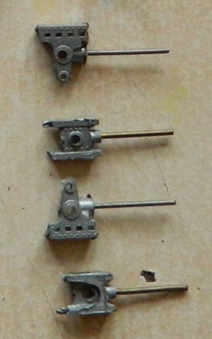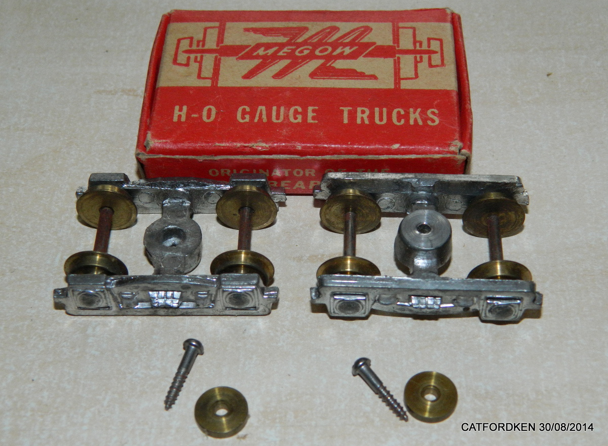 Those are hard-to-find little devils, and if you have no use for them, keep them around, because sometime I'll have a use for them myself. 3-piece trucks cast in particularly soft white metal, so I'm told. Prototype trucks were used on light passenger cars and express reefers.