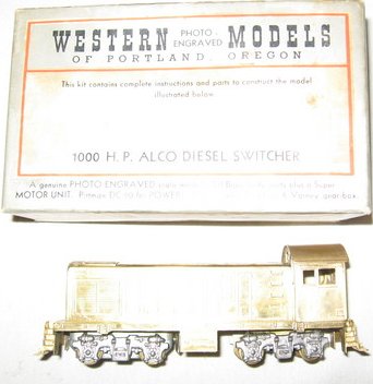 According to HOSeeker, it "contains a Varney coil spring with pulley variable speed drive with side frames using a DC-60 Pitman motor. Motto of company 'Made in the West for Model Builders Everywhere'." Evidently this is the only kit the company ever manufactured, of an ALCo switcher sometime in the 1950s, and for some thoroughly bizarre reason they tooled their very own completely wrong EMD trucks for it. The ones shown are zamac but yours are brass, however they're rather distinctive and otherwise an exact match.