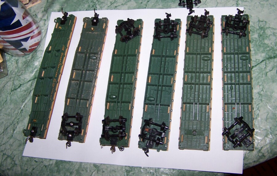 While cleaning/sorting stuff in the basement, I ran across a bin I'd put flat cars in to modify a long time ago, and 4 more Tyco green flats and a Trailer Train flat came out to be modified the new way. Had to toothbrush the TT flat, as it was dirty and had spiderwebs on it. Ick. The others were mostly clean. So I've already torn them down, and glued in the flange inserts. I'll mark and drill them for Kadee pockets after the glue dries. Here's a pic of the 6 green ones, two already done and ready for new trucks, and the four just-found ones. I probably have more around, but these are what I can get my hands on right now. Will keep hunting for more as I clean up.