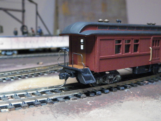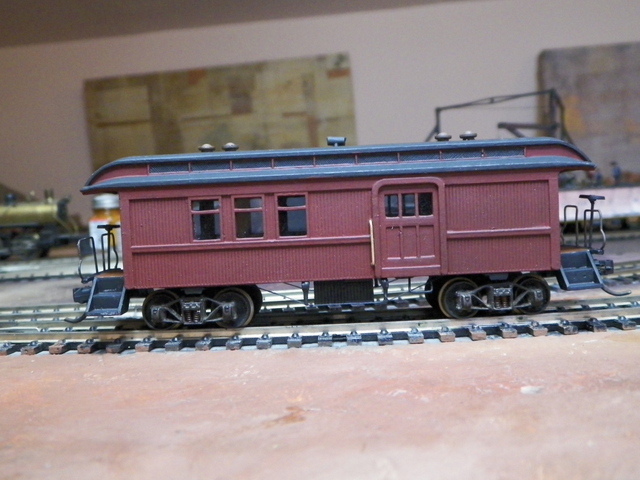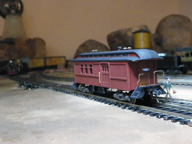 This is a Laconia Sierra Combine. Looks quite a bit like the Roundhouse and Ulrich models, though a bit smaller than the Roundhouse. Car body and roof are metal. Floor is wood with metal platforms, etc. Looks to be a twin of the Ulrich stuff? Company business deals there? Anyway, I bought this as a prebuilt; the floor was broken and previous repairs were not aligned, but the wood floor was not too bad to duplicate.