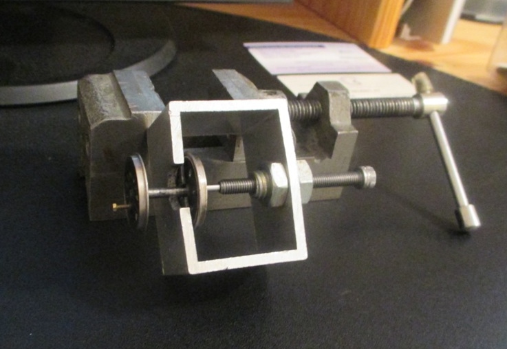 Last a photo looking down on the wheel set in the quartering tool. Remember the long screw is in the insulated wheel, it is on the left side.