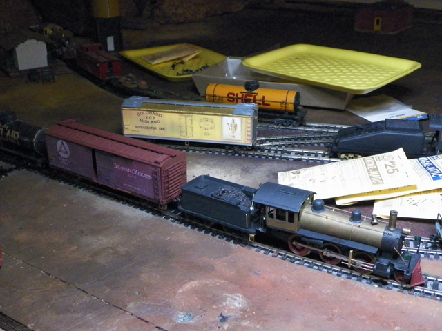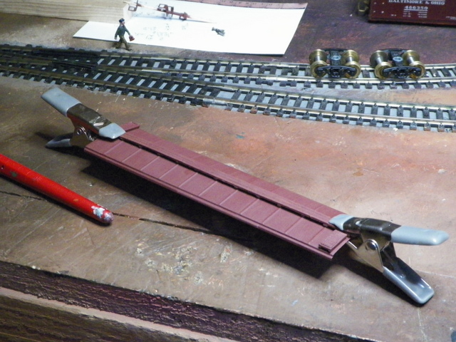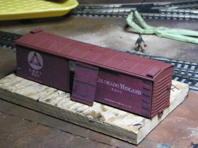 I briefly considered using some styrene angle "iron", but that would not have represented sound construction practice and I really didn't want to stray much from what Mantua provided right out of the kit box. So, I resorted to using the "steel" car ends that come with the box car. And the car already had a "steel" roof which was not really in the time period for a Colorado Midland box car anyway. That's why I'm calling this car an "homage" . . . sort of honoring the style of the Colorado Midland brand . . . with a wrong period car. Heresy! Probably also heresy to Mantua collectors who think cars should be left as they're found. I do kind of dig some of the cars just as they are and I want to have one consist of cars as untouched by me as possible including keeping the original hook and loop couplers. I think it would be a trip to really get those uncouplers they had for those things working. It would almost be a must if you didn't want to go through contortions each time to get them apart.