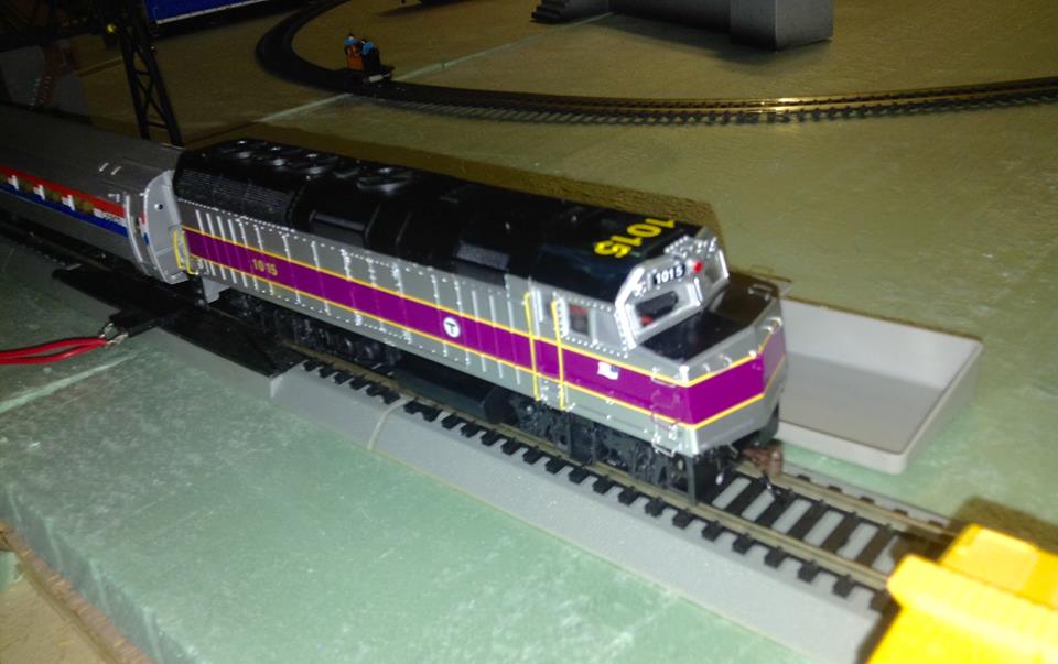 My friend also got an MBTA F40PH locomotive for the layout! It's a Walthers TrainLine model, and had custom detailing added. Now he plans to put a decoder into it (incidentally, the real MBTA F40PH prototypes like this have all been retired now, in favor of their brand-new HSP46 locomotives and the early 90s F40PH-2Cs.)