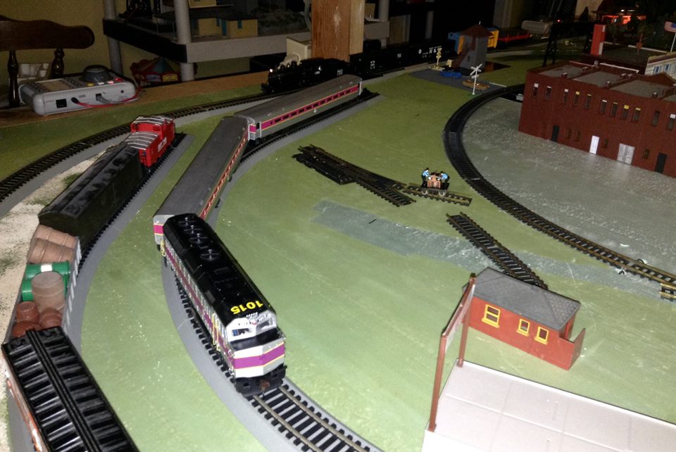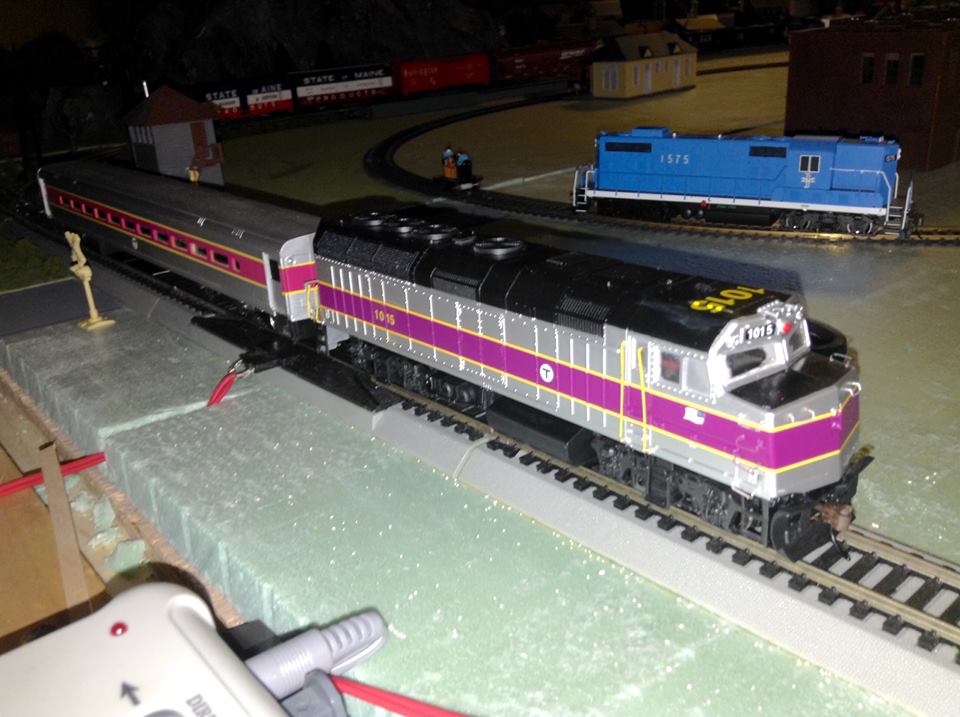 An MBTA train on the layout. I got a couple of old Walthers MBTA cars secondhand; one regular and one cab. The cab one is missing screws for a coupler cover, so that one's going to need a bit of working on.