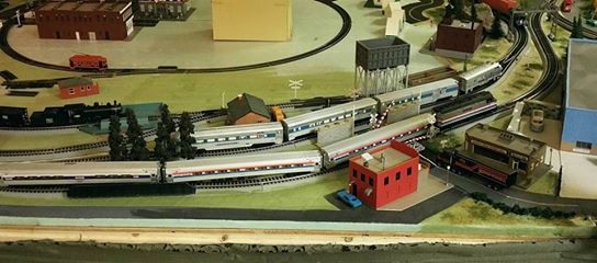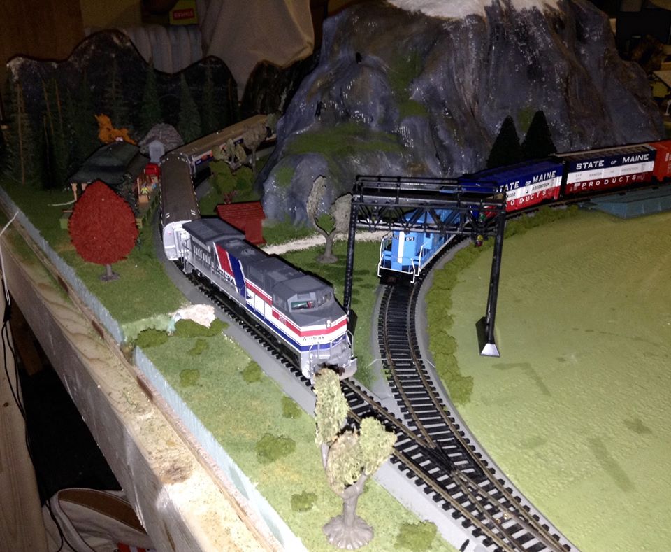 The two main trains on the layout; my Amtrak "Pepsi Can" Dash 8 locomotive and Amfleet cars, and another volunteer's Bachmann Boston & Maine sound-equipped DCC GP9 pulling several freight cars.