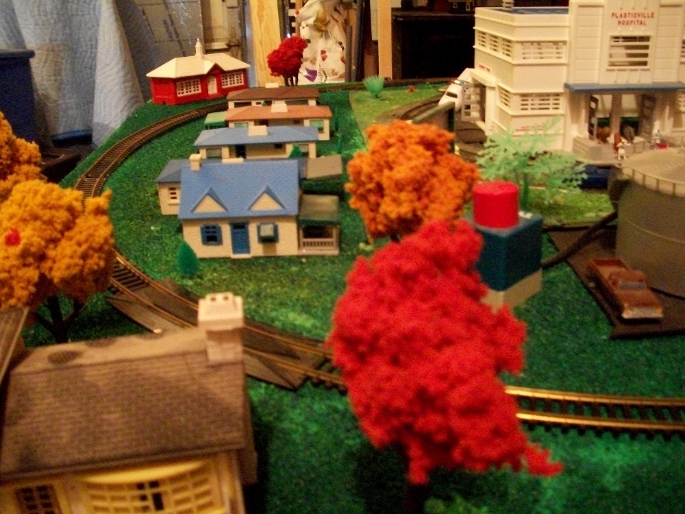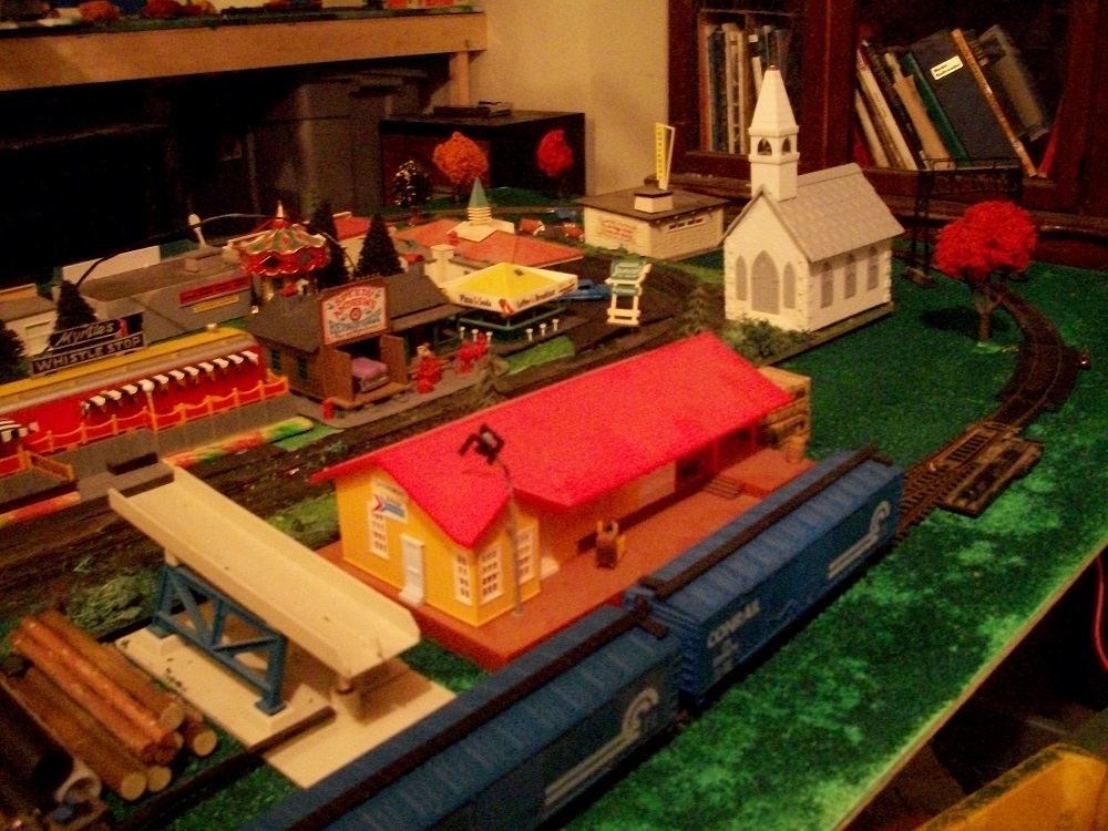 This is Tycomania V, that is to say, the fifth attempt. The first attempt was 5' x 9', double track and incorporated a slot car set. Very ambitious, but not practical. Shrank it down into three versions of a 4x8, eventually abandoning the slot car. This fifth, and last attempt, is a single track using vintage brass track. The center trolley piece lifts out and the buildings safely stored in a storage bin and the two boards, trolley and railroad track, stored flat against the garage wall. Sometimes less is more. This one is 3.5 feet by 6' and sits atop a standard folding plastic table. Next: to the train shows.