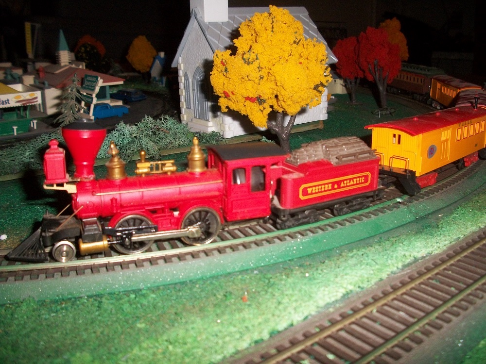 | The colors of the trees and old time train set are nice Jeff. Those other trees will come in handy on your layout Walt. The model cars are also nice Stephen and Jerry.