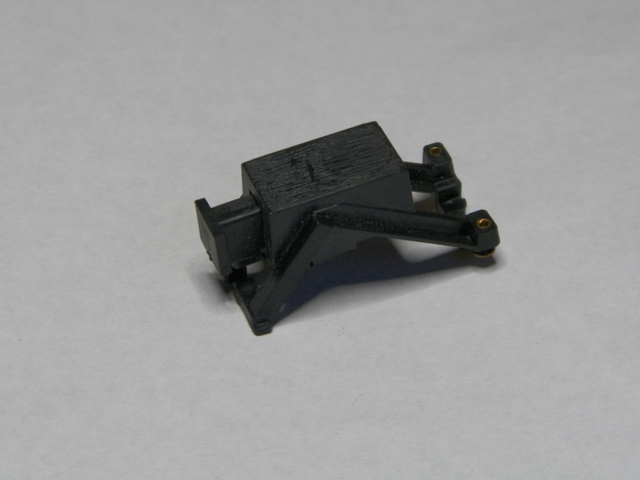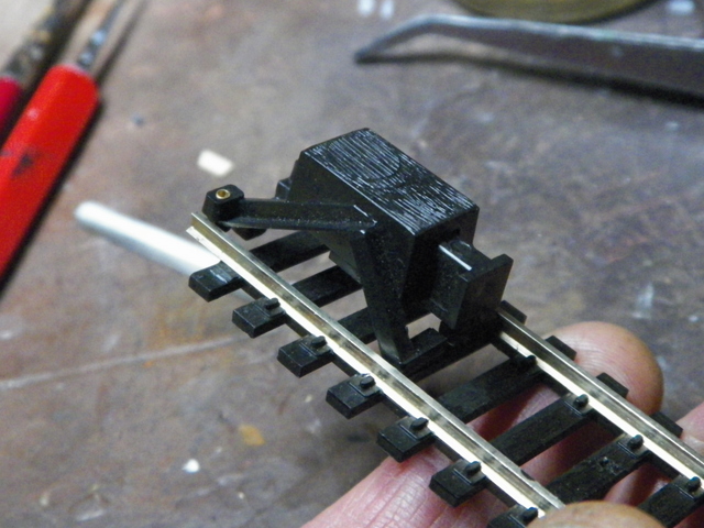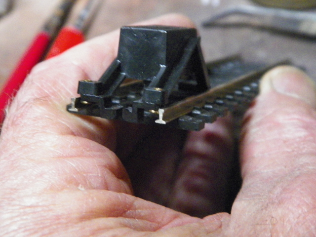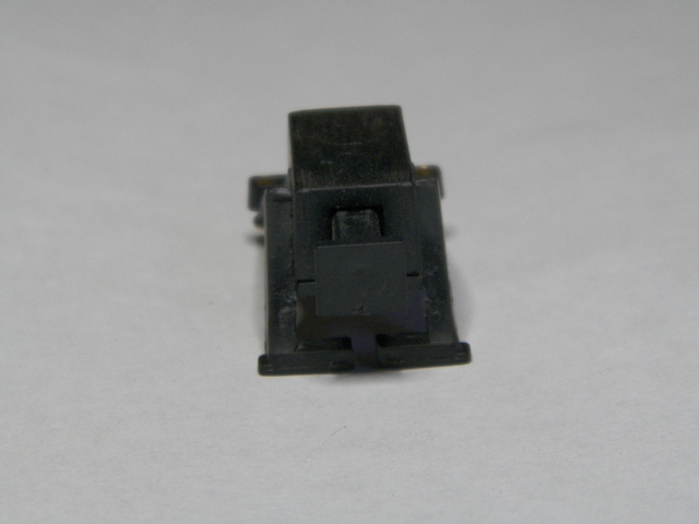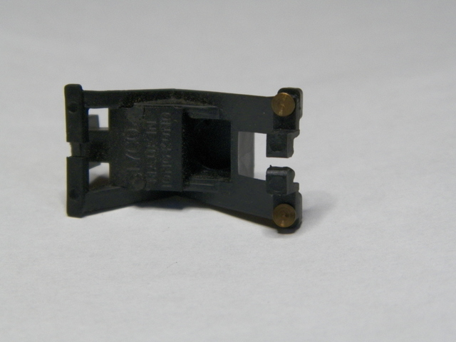 This is a Tyco "Made in Hong Kong" bumper. It came thrown in with something else I got and I couldn't figure out quite how it was suppose to work. Then I see you can slide it into a piece of track and it will make "contact". The bumper itself is spring loaded and apparently triggers a light (which was not included; there are a couple of little brass ports for wires from a light . . . or perhaps a little recording . . . "hey, watch where you're goin'!" . . .