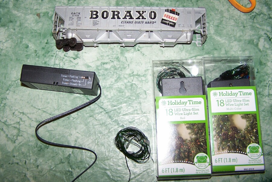 Earlier this week, I visited a Wal-mart, and found they had some neat battery powered LED lights, and the box controller offers 3 functions - On, Flash, and Fade. Now, finding a fader circuit has been one of my quests for awhile, I did buy a kit last year at the Micro Centre computer place, but that cost about $17. This set has 18 LEDs ( either multi-color, or red ), with the x3 AA battery power, and it has all the functions I could want for $4 ! I went to another Wal-mart tonight on the way home, and got 3 more of them. I need a fade circuit for my Halloween haunted train consist, and figured this was the cheapest way to get it done. I'll bet the fader could be usdd for a Mars light, too. The LEDs look like water beads on a windshield, not the typical dome-shaped type. I will probably cut them out to use green ones anyway, since they don't have a green version apparently. Anyway, for $4, I figured some of you guys might be interested, so I post this here. They come in a clear plastic box with green label, called Holiday Time. In a green cardboard tray on a shelf. Some wal-marts don't have these, though, I've been to 4, and 2 didn't have them ( the 2nd and 3rd wal-marts I went to didn't ). Just a heads-up if you're looking for a neat little item that could be very useful on a layout for some lighting tricks.