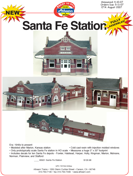 Can't say I was wild over the John Deere dealership; the Coke bottler; the Water Tower; or Grain Elevator...however Athearn has announced another ready-built model. My biggest concern on them is the cost...this ATSF depot is $129.98. Will have to see what one looks like though before I pass judgment....