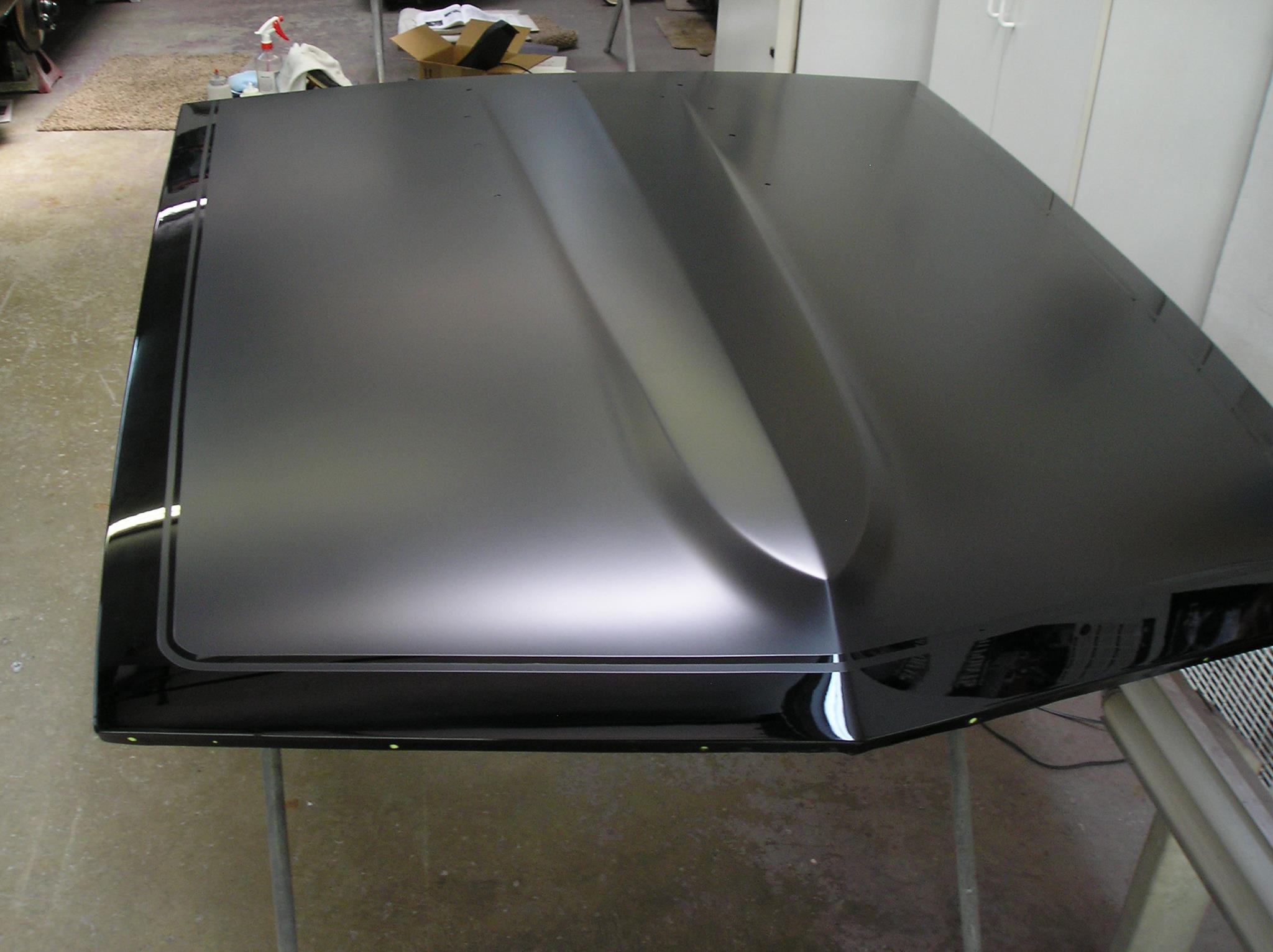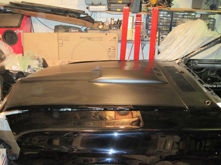 This is the custom paint I had done to the hood. The paint color is actually blue pearl on black. The blue only shows up when headlights or a flash of light hits it. Otherwise it looks black.