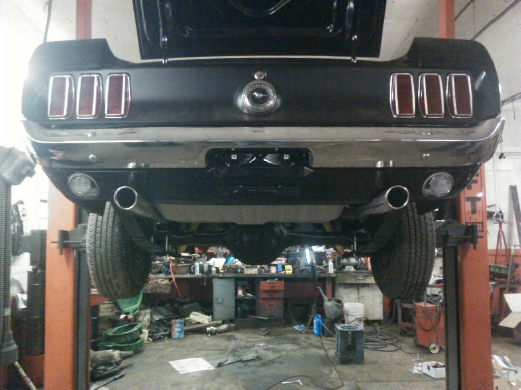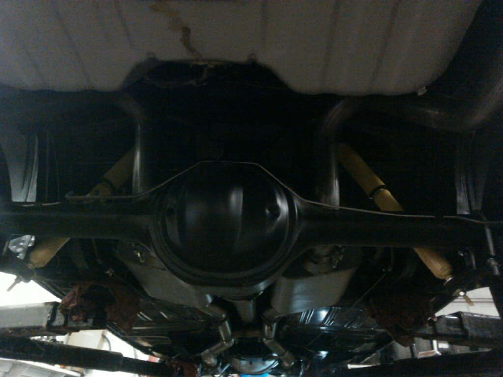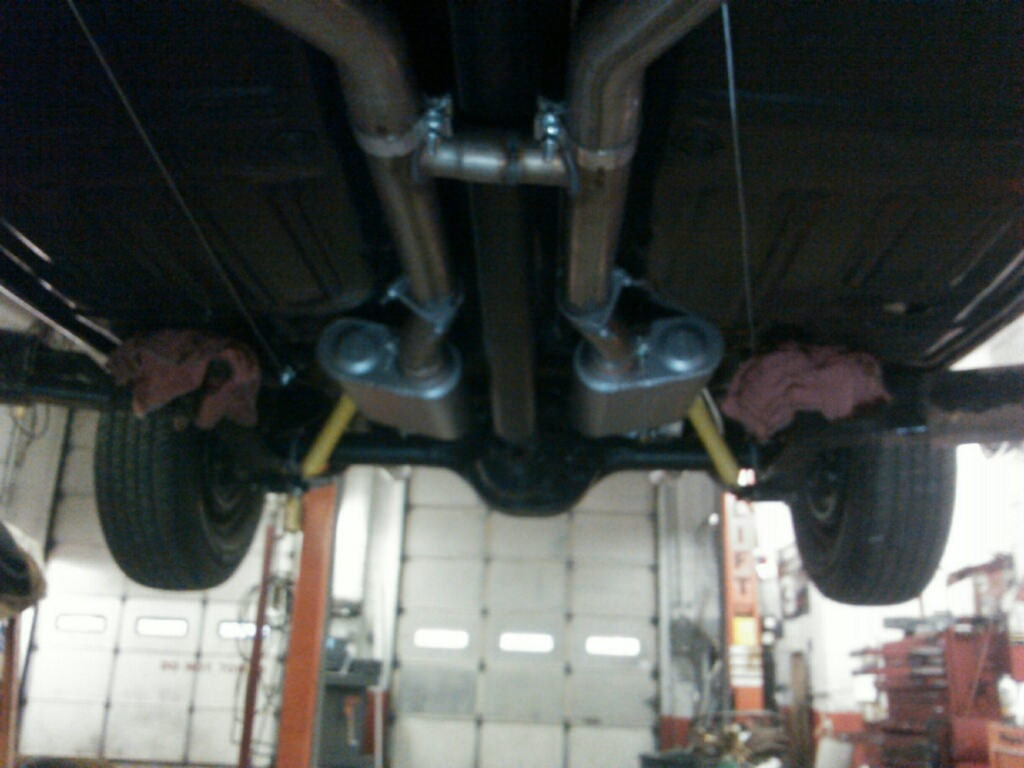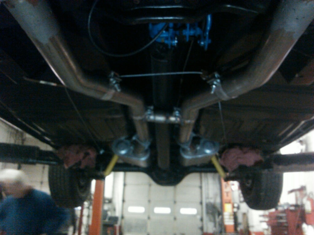 OK.. well for some progress. The shop text me the following images. I did not have a chance to see her in person yet. The mufflers look a little crooked. He called me and said he had some trouble getting the system to fit. From what I can see in the photos, since the wheels are not supported, the rear axle is pushing down on the drive shaft which in turn is pushing on the H-pipe cross pipe. If you support the rear wheels by placing a transmission jack under the pumpkin and raise it up a few inches, this will reduce the load on the exhaust. You then should be able to straighten/level the mufflers.