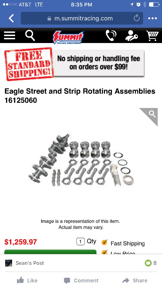 So after a lot of searching and discussions with my Mustang buddy Paul, I decided on the following parts... Since the machine shop said I should go to a 0.060 bore over, my options were pretty limited. I found this rotary assembly at Summit Racing. There apparently would be no options here if I had gone with a 0.040 over bore... Through a combination of the bore and a stroke change from 3.5 inches to 4 inches, it will create a 414 cubic engine from my original 351. I plan to have the shop balance everything and with Paul's help, I will be assembling it myself.