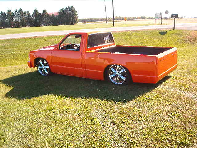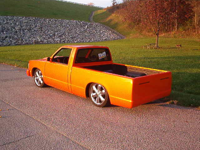quote:One of my favorite builds was this S-10 a few years ago. Many body modifications including remote door openers (no door handles) , no visible gas filler door, etc... Air ride was added to raise & lower the truck...Could also hop around by moving the air ride controls quickly... House Of Kolor Tangelo Pearl Orange polished to a mirror finish. The owner told me later "its so slick that the cover wont stay on it in the garage"...