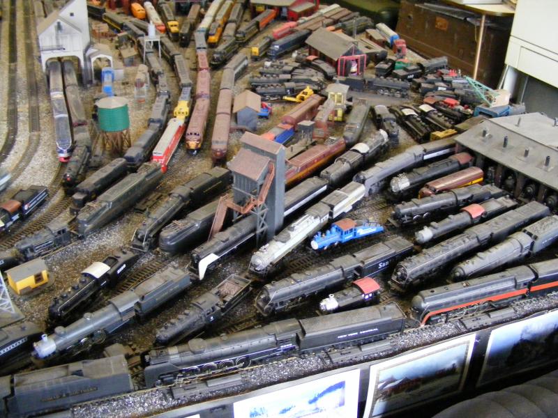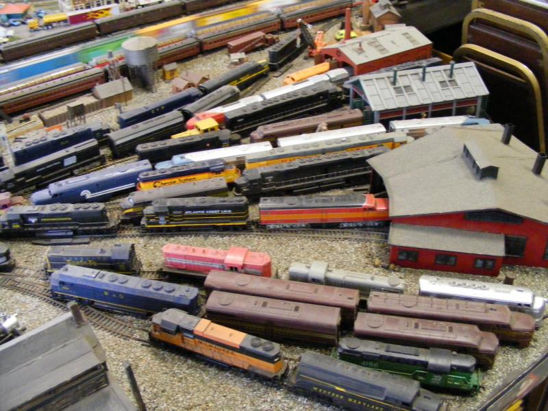 We asked him several questions about the locomotive "bone yard" he had and that was fascinating. He would buy cheap loco's at train shows for a few bucks and just run them. He would always have a few in reserve and they would spend time on the work bench getting their drives serviced before going on the layout for a long haul. He said it was always a issue since these trains would run for a few hours on end that you would see wear you wouldn't see otherwise. You name the manufacture and he would tell you the list of things that were usually prone to fail. His favorites are Athearn blue box. He said the prices on them of have come down dramatically, they can pull hard, and see to have the best endurance before kicking the bucket. There was a triple header of blue box FM trainsmasters running a massive 60-70 car trail around (you can see it in some of the pictures). He has a soft spot for old Marx engines and said he's had several go on to do really long stints on the layout. He said oddly enough on occasion he'll come across a old Life-like engine with the pancake drives that will really stick around. He also noticed some of those same life-like's don't seem to mind bad trackwork so he keeps them to the one track up on the mountain. He's had some friends with some more expensive stuff come down and run. He said some of them could hang for a few hours while others could not. He said a few MTH & BLI products have run there and have either had issues with the track or had a failure after awhile. That said, he told me if he can get a Rivarossi Big Boy for the right price he is going to run the wheels off it haha.