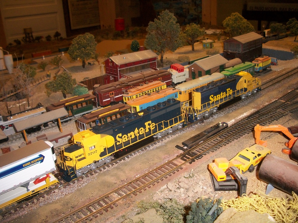 Photo shoot of my bud Robert who is a 17 year veteran Hogger of the UP. He started out in the track gang in Tucamari, NM in the middle of the desert. He lives and breaths train, and models a Fantasy League Santa Fe as it might have been. His other passions include football high school to NFL and Shelby's. He regards my Tycomania with an amused skepticism. Says he has yet to see a 1:1 horn hook. Photos taken last week at El Paso Model Train Club. Standing invite to all TFer's bring your train, (visitors always welcome and free!!), and tour the lines!!
